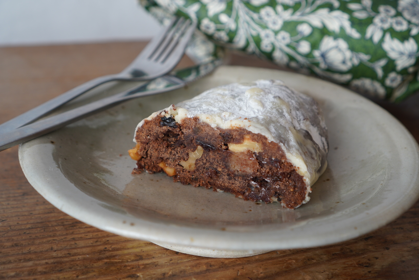 ずっしりとした生地にドライフルーツやナッツが練り込まれ、表面は粉砂糖で真っ白。これは、「幼いイエスがくるまれている、おくるみ」を表していると言われています。